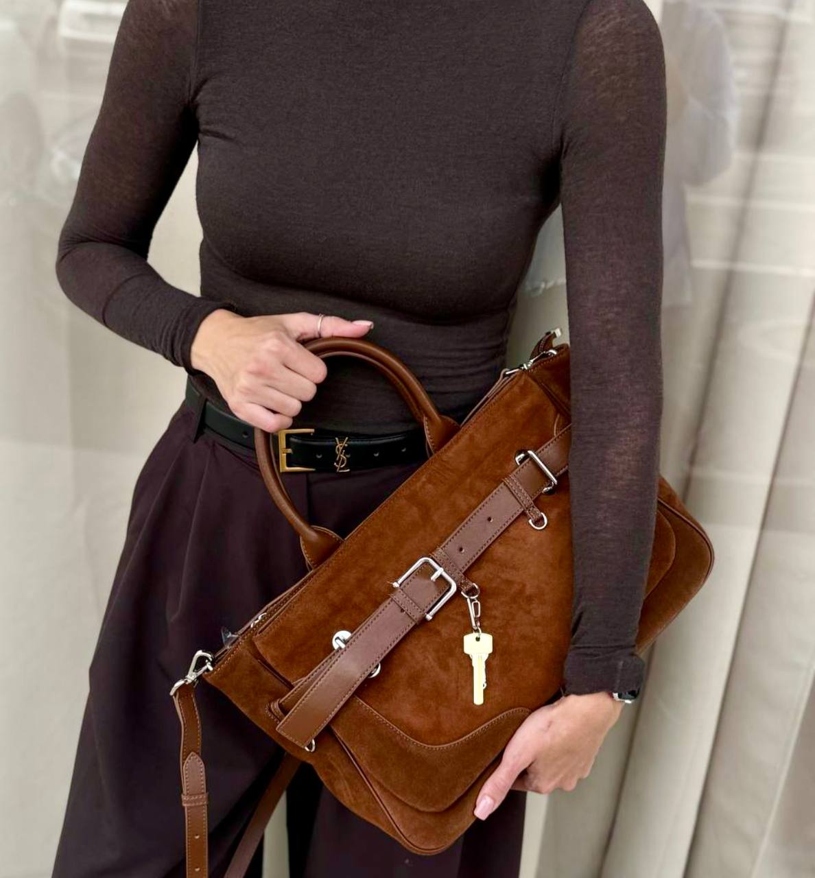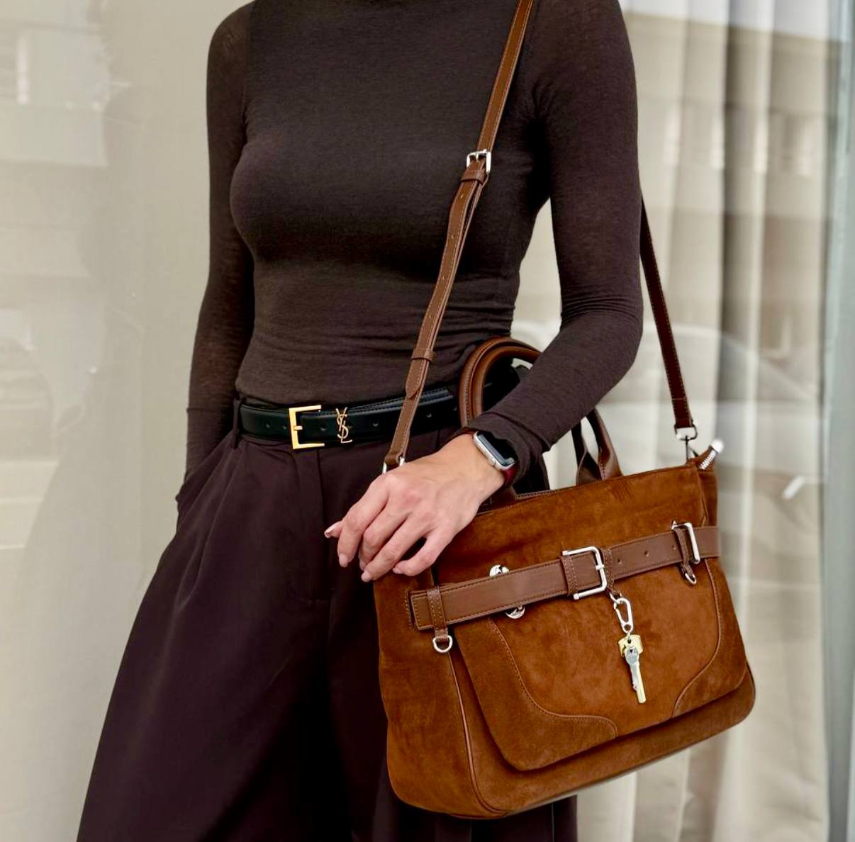 תיק עור אמיתי בטקסטורת ז׳מש מאובזר בחגורת עור אמיתית בטקסטורה חלקה מגיע עם רצועת עור ארוכה אביזרים בגוון כסף