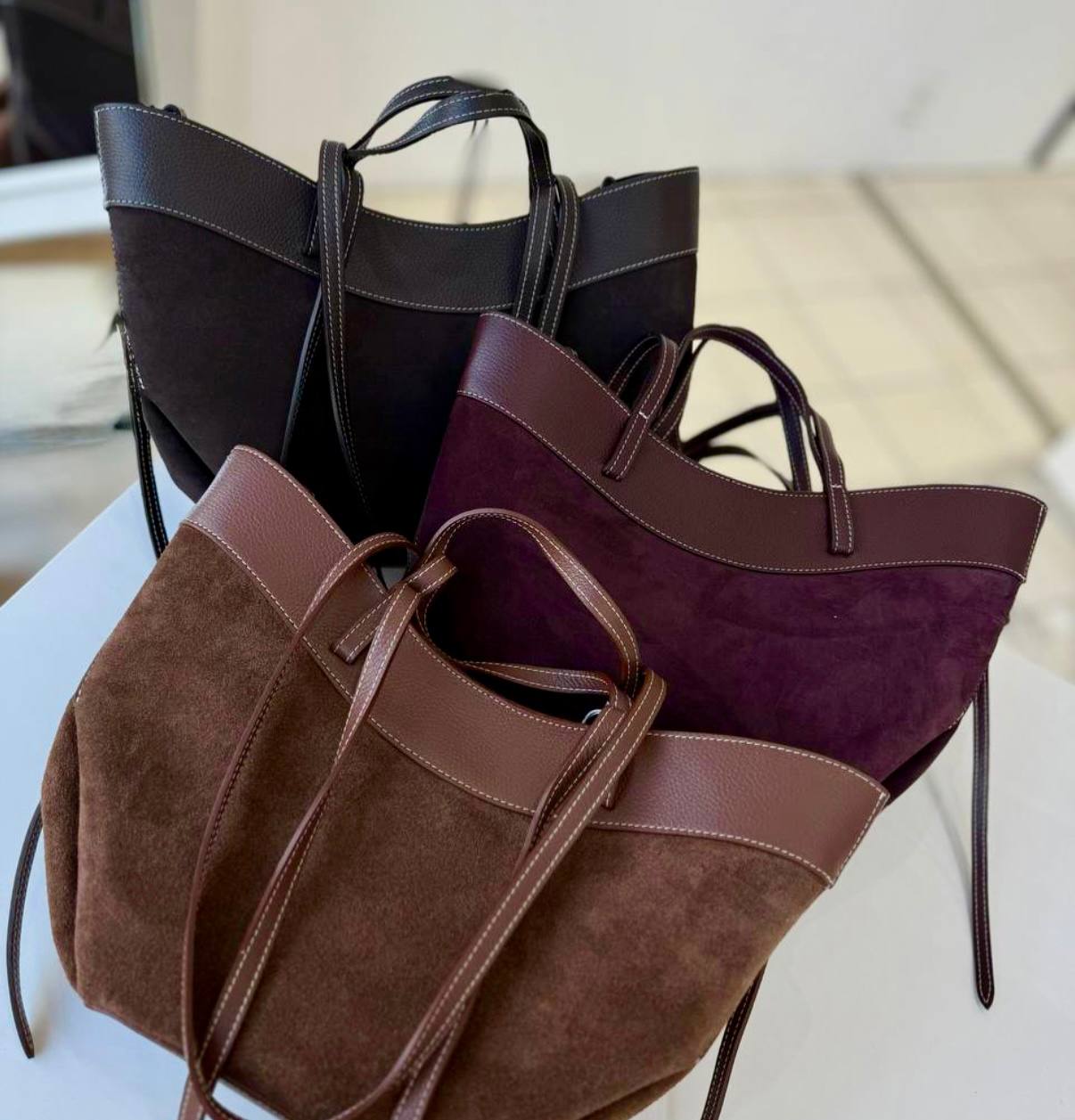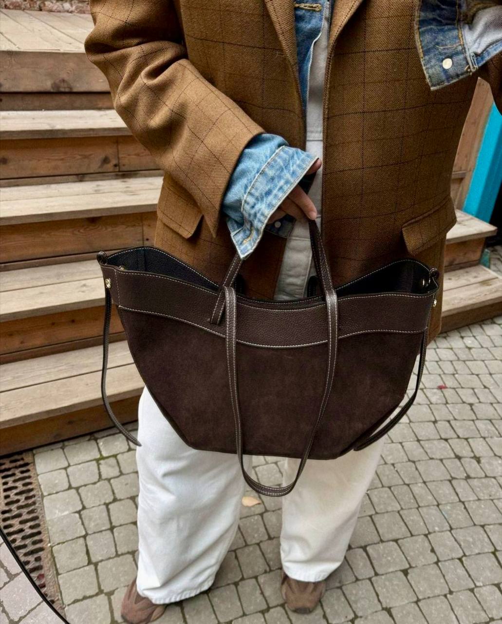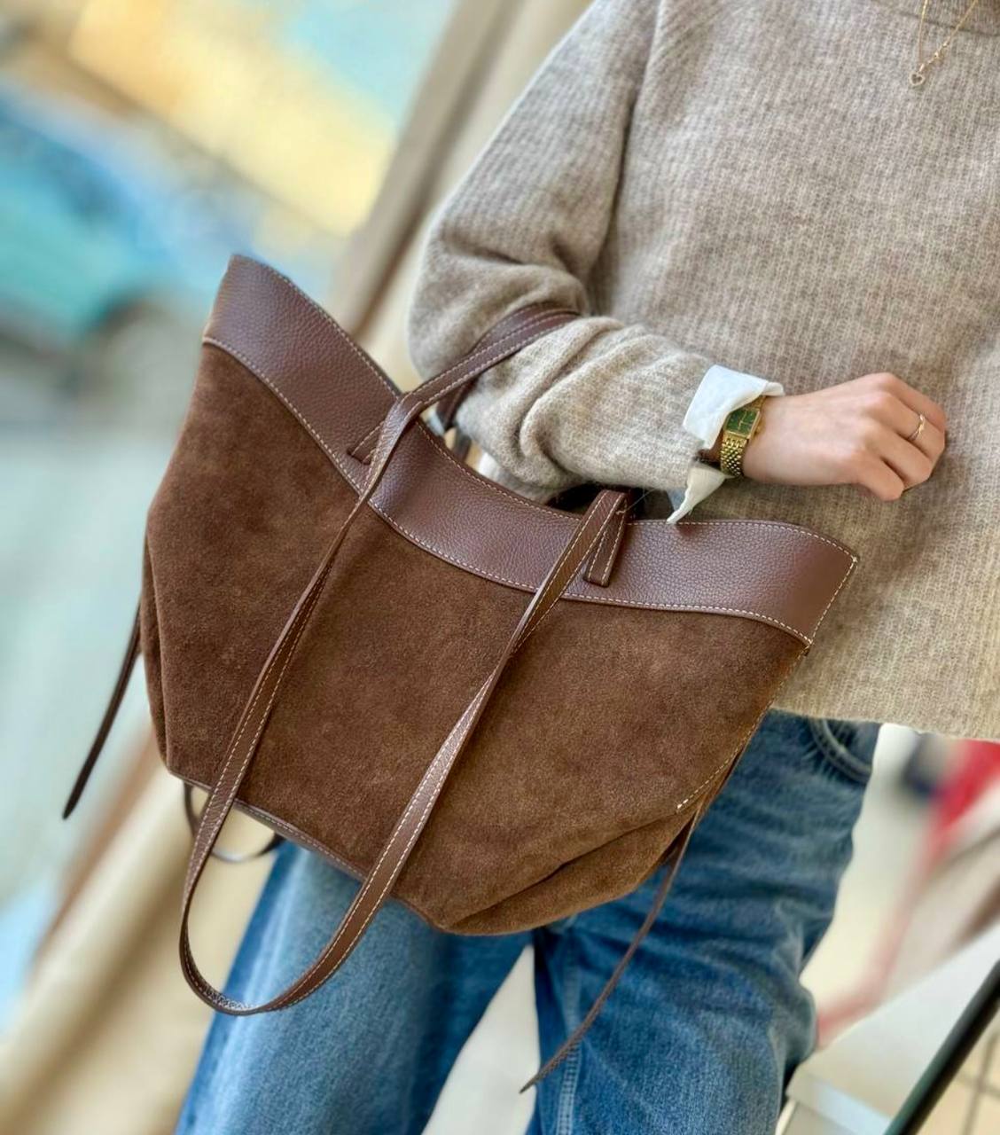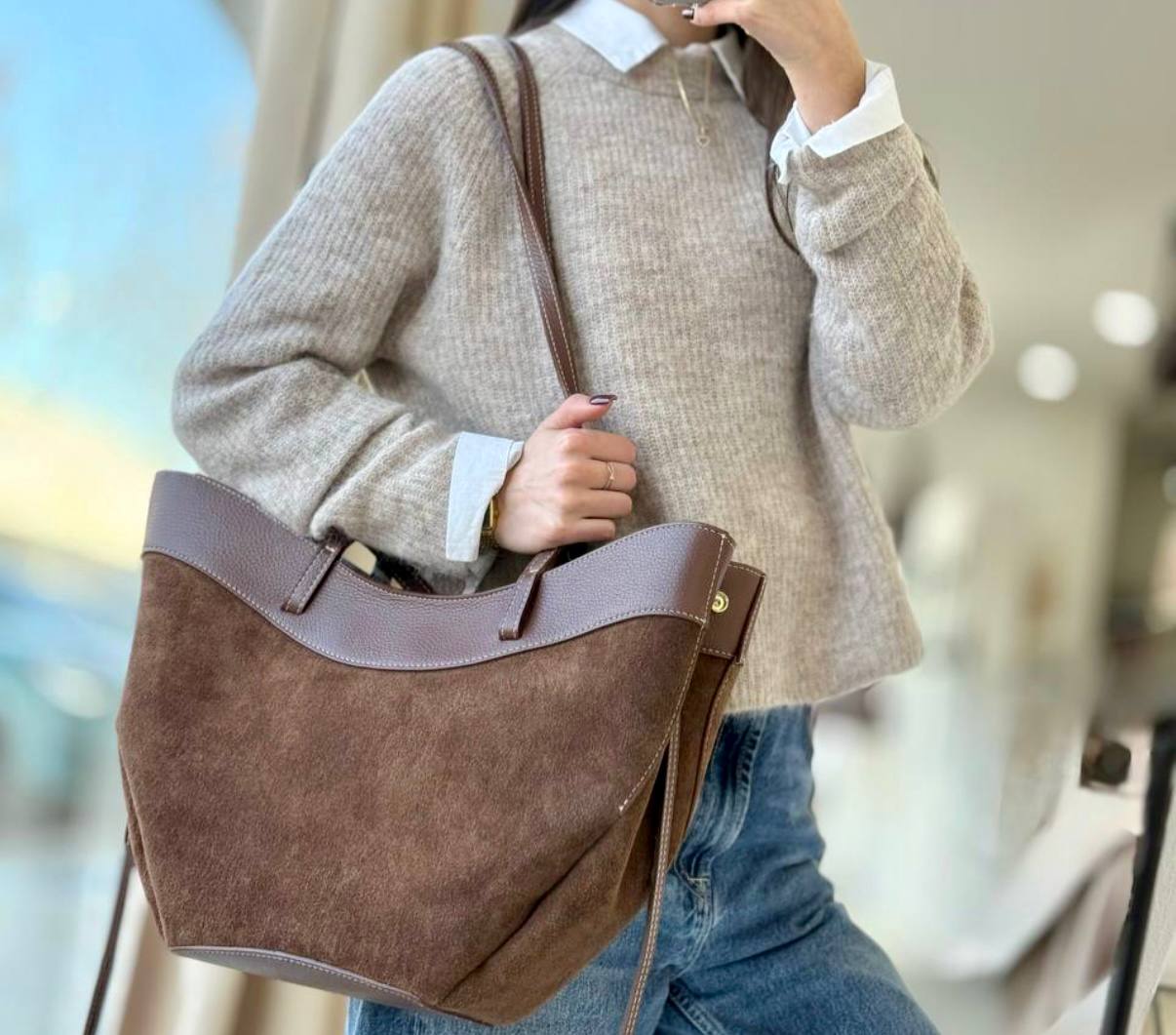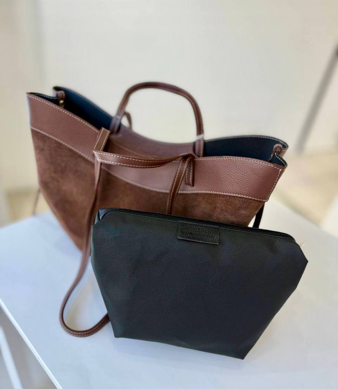 תיק עור אמיתי בטקסטורה גרגירית משולב עם ז׳מש מגיע עם רצועת עור ארוכה ותיק קוסמטיקה מעור אמיתי בטקסטורה גרגירית אביזרים בגוון זהב