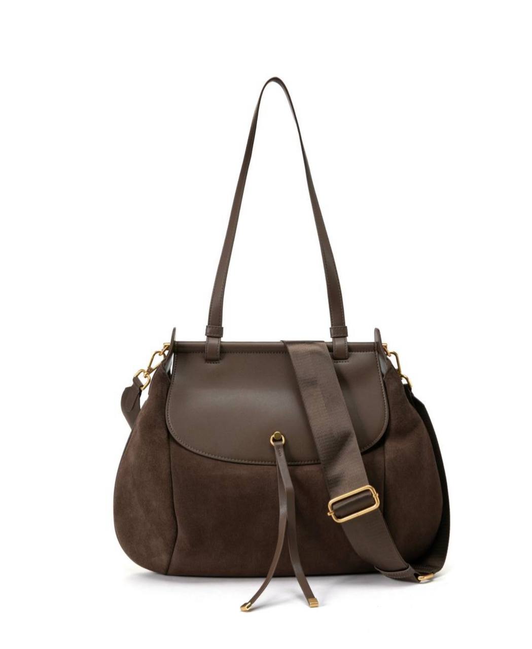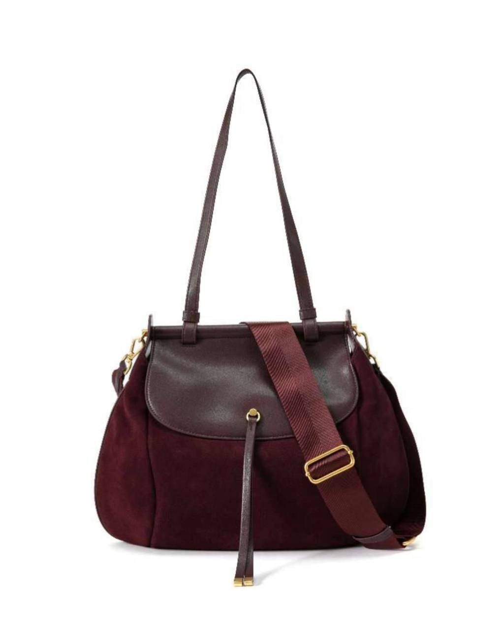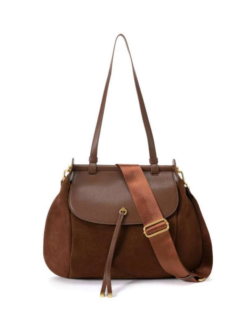 תיק עור אמיתי בטקסטורה חלקה משולב עם ז׳מש מגיע עם רצועת עור ארוכה ורצועת בד עבה ארוכה אביזרים בגוון זהב מידות: 43X27X10
