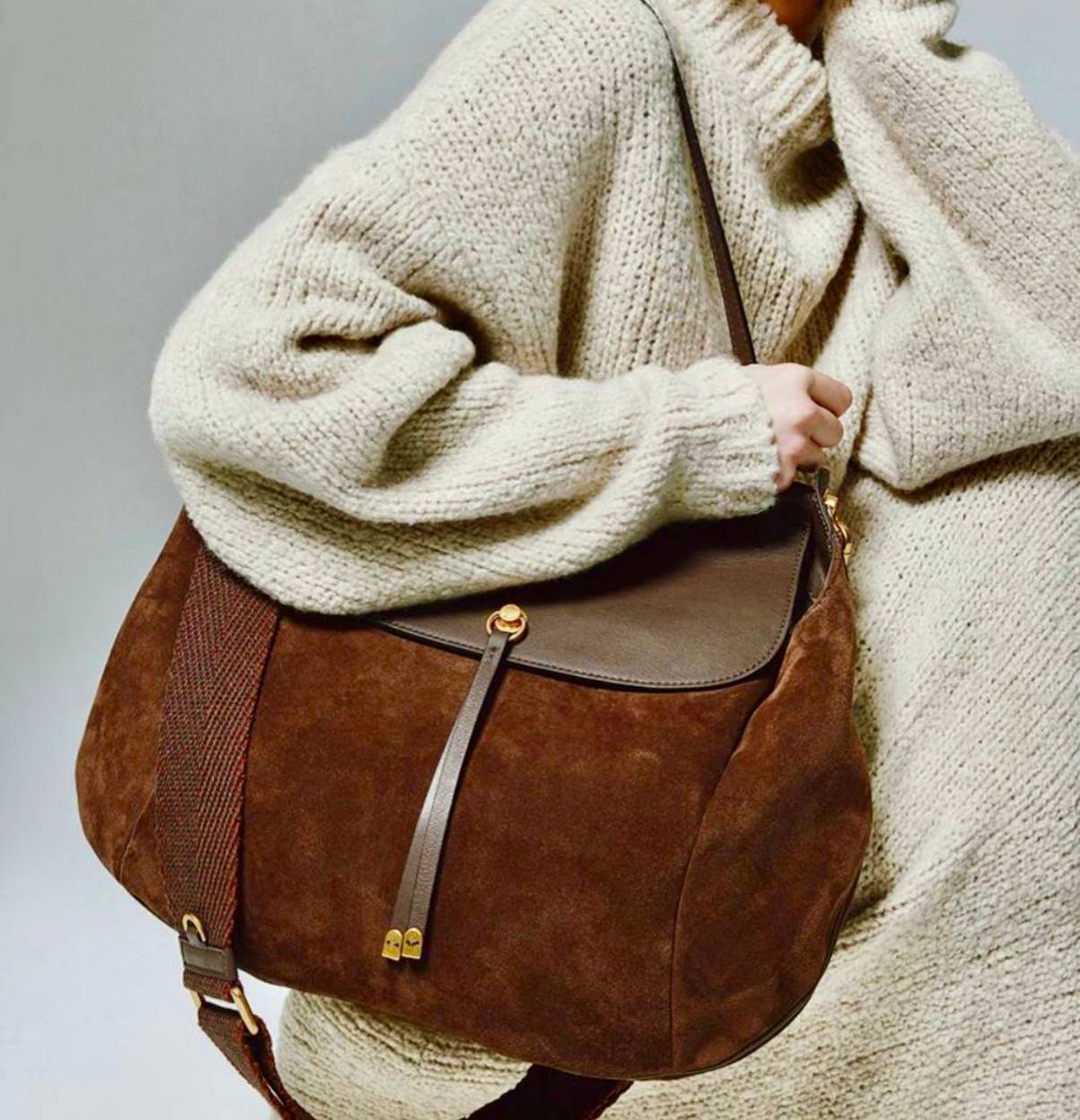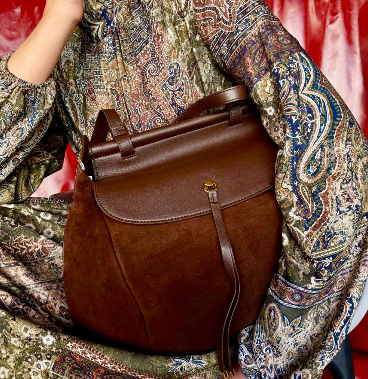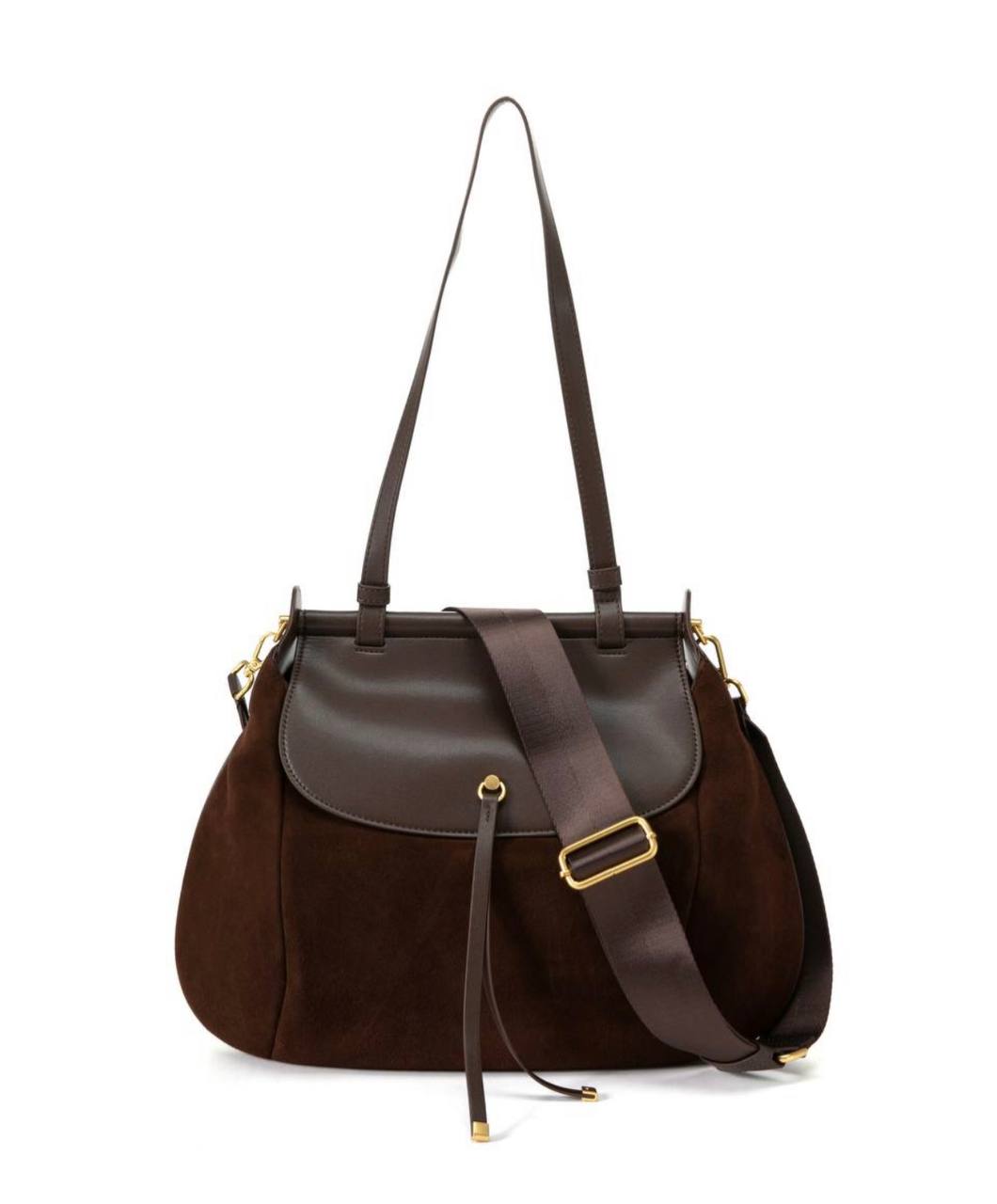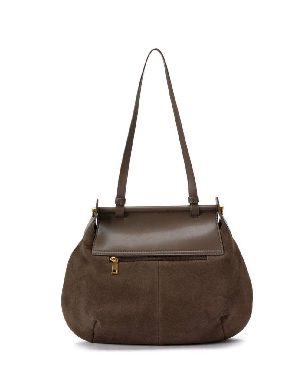 תיק עור אמיתי בטקסטורה חלקה משולב עם ז׳מש מגיע עם רצועת עור ארוכה ורצועת בד עבה ארוכה אביזרים בגוון זהב מידות: 43X27X10